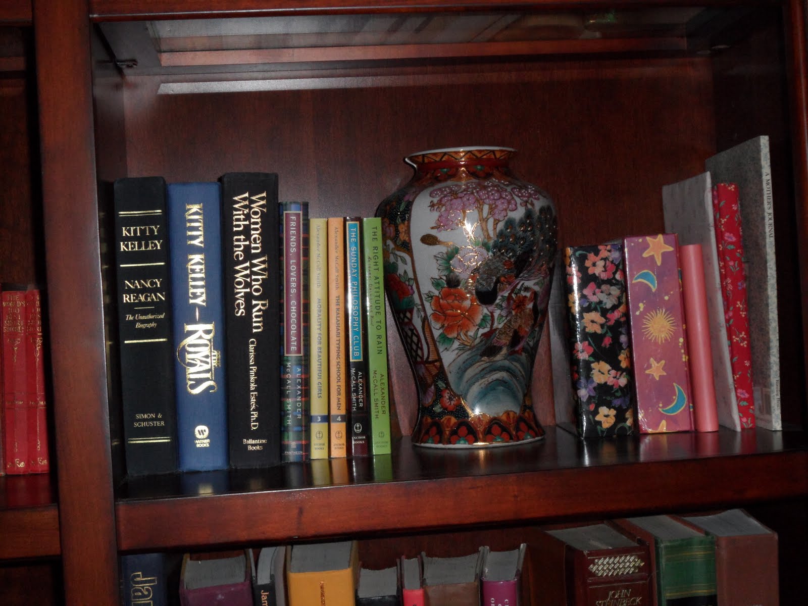 Our bookcase was purchased at Costco, so large that it had to be assembled in place and probably a Hogwarts wizard came in to assist. I'll never know as it was one of those tasks that I was too nervous to watch. Glass shelves were involved. The dayroom bed came from our son; it has been referred to as the German bed by all his sisters who have used it at one time or another. The bed is actually from Italy, purchased when he lived in Germany as a bachelor. We needed to shorten the legs to get a correct fit in the room. It makes for cozy reading. The white bedspread covering the bolster pillow was my Grandmother Henderson's pride and joy. It has a hole or two but otherwise has remained pristine white--just the way she wanted. (Grand kids were not invited to climb on that bed). The giraffe table was a gift from Maria. The desk was one of those oak reproductions that I refinished in mahogany. The fancy panels bordering the desk came from a carved wooden Indian screen. These screens were such popular black-market items when we lived in Korea that the Officer Wives' Club gift shop required the military sponsor to purchase them. I'm still amazed that David stood in line to buy it for me as shopping has never been his favorite activity. The books are all mine and are in no body's way.